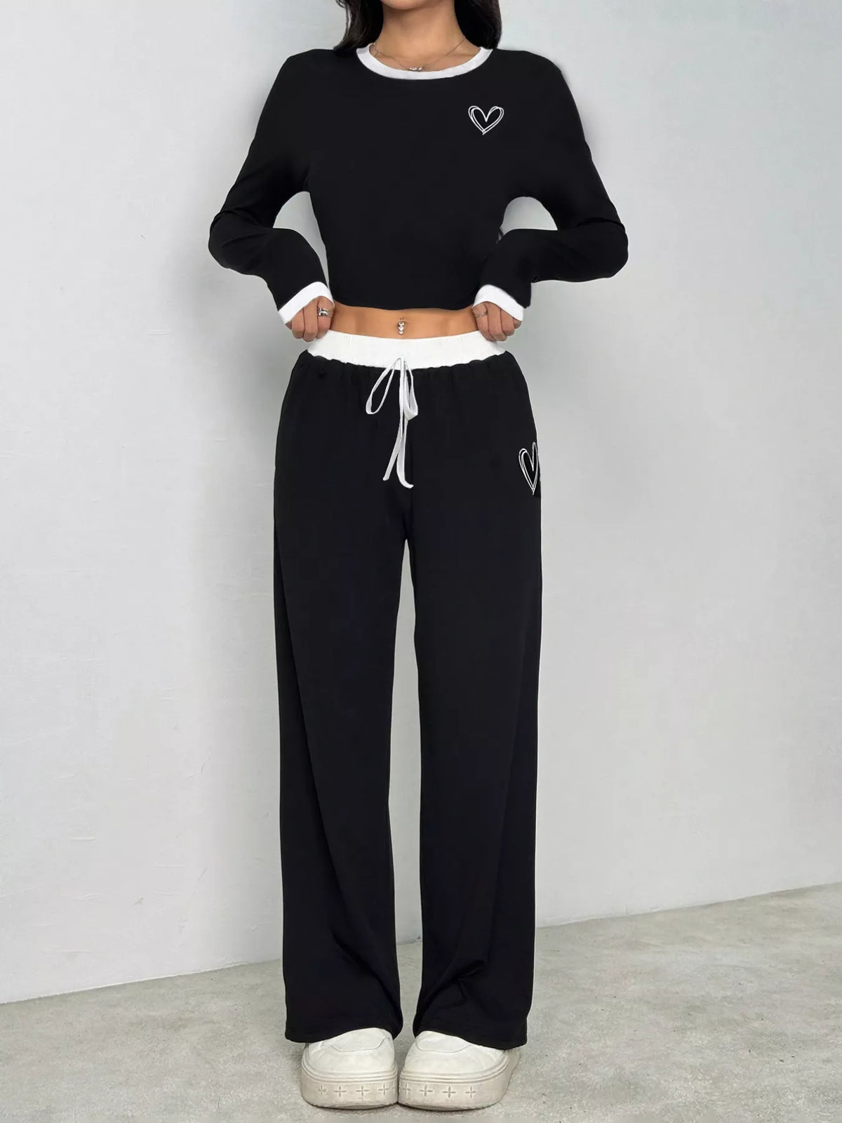 Contrast Trim Crop Top and Wide Leg Pants Set - Black / S